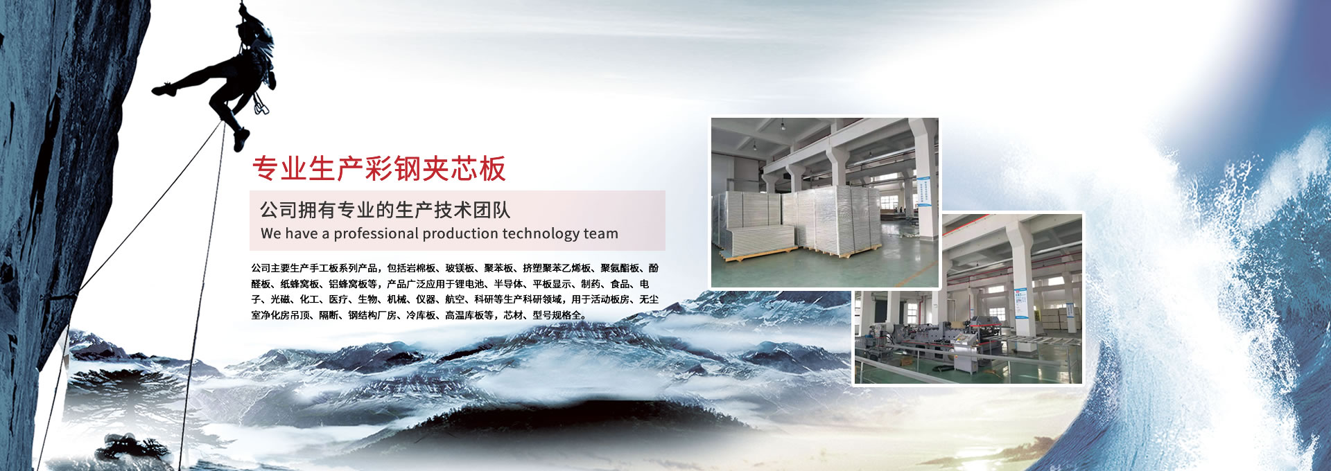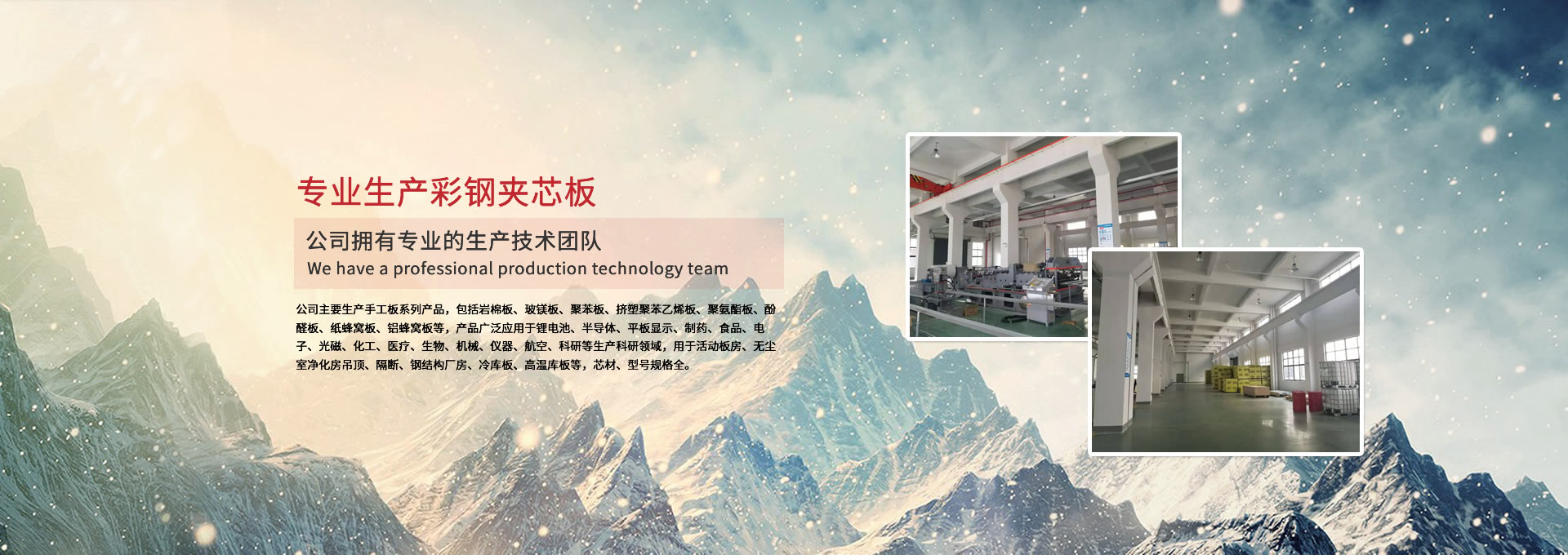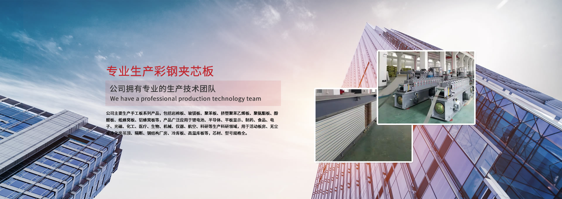 公司主要生產(chǎn)手工板系列產(chǎn)品,包括巖棉板、玻鎂板、聚苯板、擠塑聚苯乙烯板、聚氨酯板、酚醛板、紙蜂窩板、鋁蜂窩板等,產(chǎn)品廣泛應(yīng)用于鋰電池、半導(dǎo)體、平板顯示、制藥、食品、電子、光磁、化工、醫(yī)療、生物、機(jī)械、儀器、航空、科研等生產(chǎn)科研領(lǐng)域,用于活動(dòng)板房、無(wú)塵室凈化房吊頂、隔斷、鋼結(jié)構(gòu)廠房、冷庫(kù)板、高溫庫(kù)板等,芯材、型號(hào)規(guī)格全。 公司擁有專業(yè)的生產(chǎn)技術(shù)團(tuán)隊(duì),周到的服務(wù)保證,以“質(zhì)量至上、信譽(yù)至上、服務(wù)至上”為宗旨,為用戶提供合格的產(chǎn)品和滿意的服務(wù),歡迎各界朋友參觀、指導(dǎo)!公司竭誠(chéng)希望與各界朋友建立廣泛聯(lián)系,加強(qiáng)相互合作、共同發(fā)展!